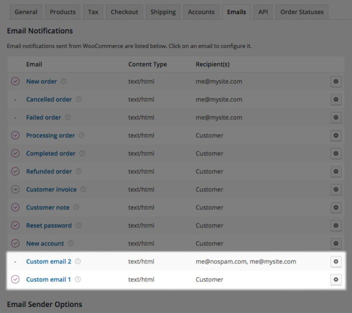 โ Back to topIf you’re experiencing issues with custom emails being dispatched, please check the WooCommerce Email settings to ensure that you’ve enabled it. We leave this disabled by default so that you have a chance to edit the subject line and email content, but then the email must be enabled to send.