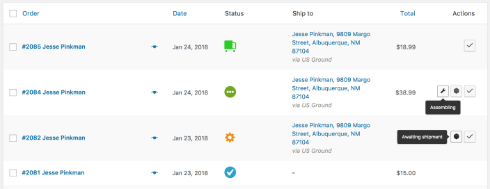 If you’ve created “Next statuses” for your custom statuses, or added a custom status to the “Next status” for a core status, the appropriate action buttons will be displayed. For example, note the processing order in the screenshot below. I’ve added “Assembling” and “Awaiting shipment” as next statuses for processing orders, so these action buttons will now be displayed for any order marked as processing.