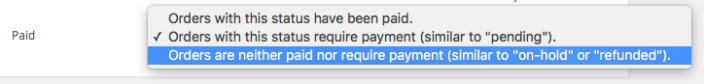 - Paid – Select the payment status of this order status. For example, if an order has been paid (think of this as a status “between” Processing and Completed), you can mark it as such.
