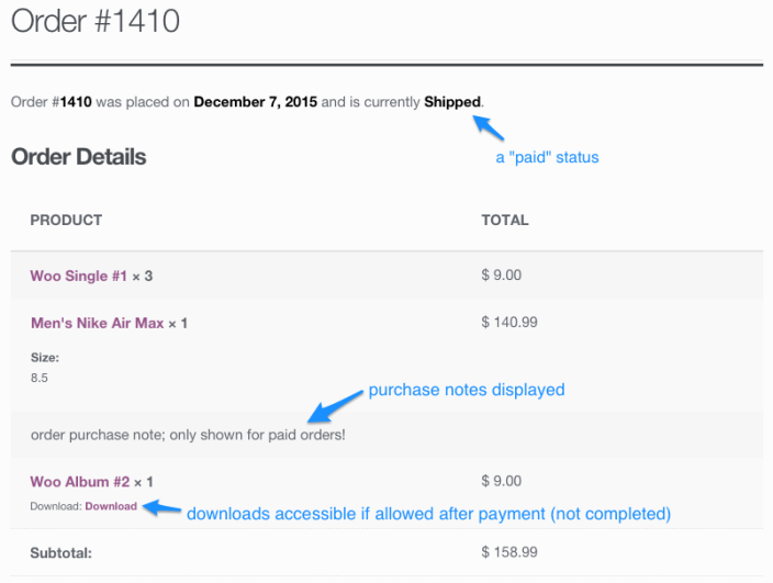 For example, if you opt to show download links when the order is paid for (processing), they’ll also be shown for this status. Other paid information, such as purchase notes, will be shown.