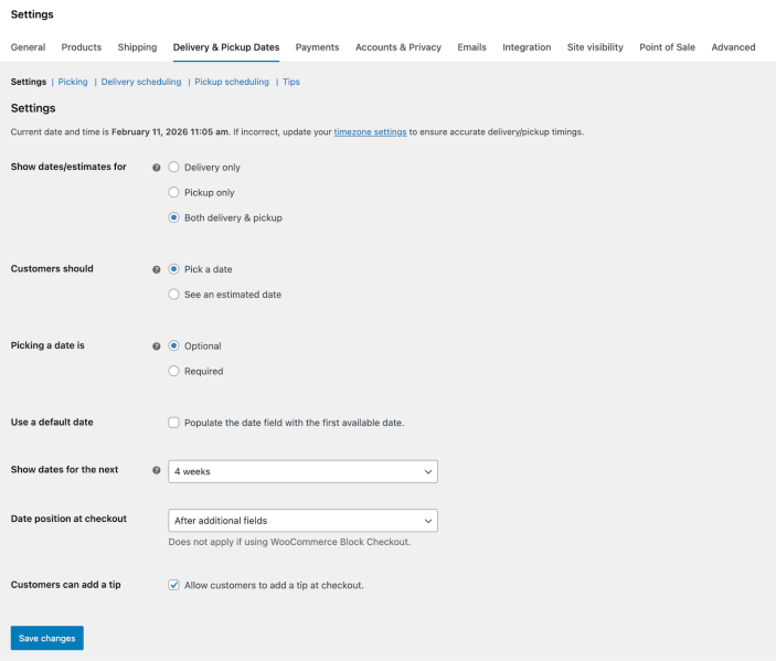 ↑ Back to topOnce installed, head on over to WooCommerce > Settings > Delivery & Pickup Dates.