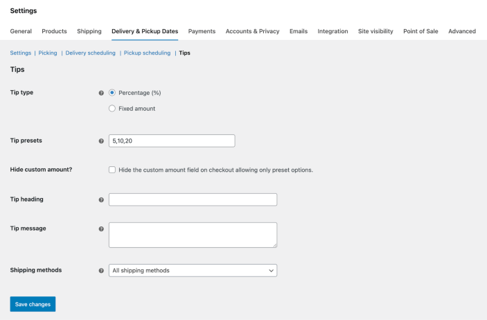 ↑ Back to topSelect which shipping methods the tip options apply to. By default, tips are available for all shipping methods.