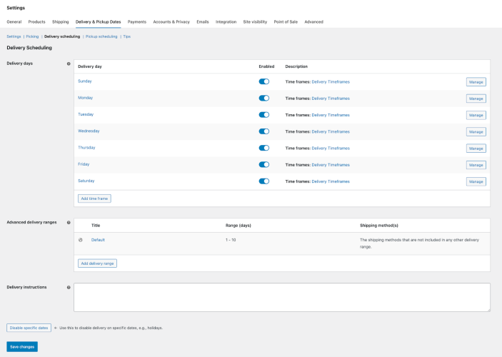 ↑ Back to topThis section is where you choose the days on which you deliver orders to customers. Be sure to click Save Changes before adding time frames – this ensures your selected delivery days are saved.
