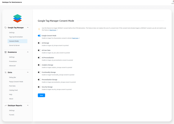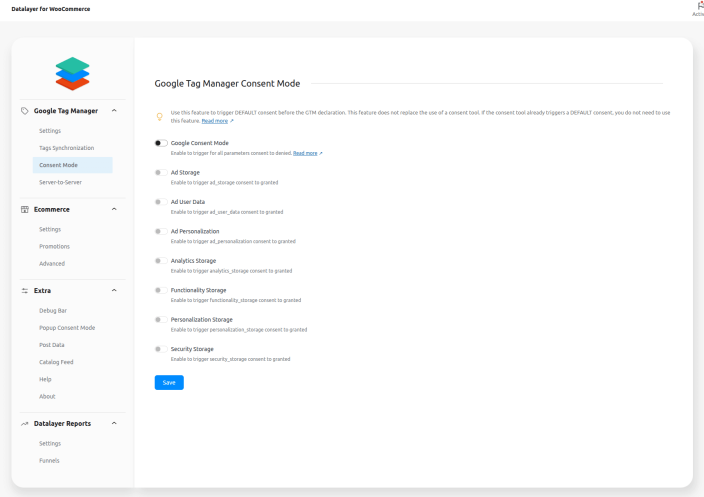 ↑ Back to topIf you want to use the GTM consent mode, it is important to know that Datalayer for WooCommerce works normally with this option, without any extra configuration in the plugin, what needs to be changed are the Google Tag Manager tags.