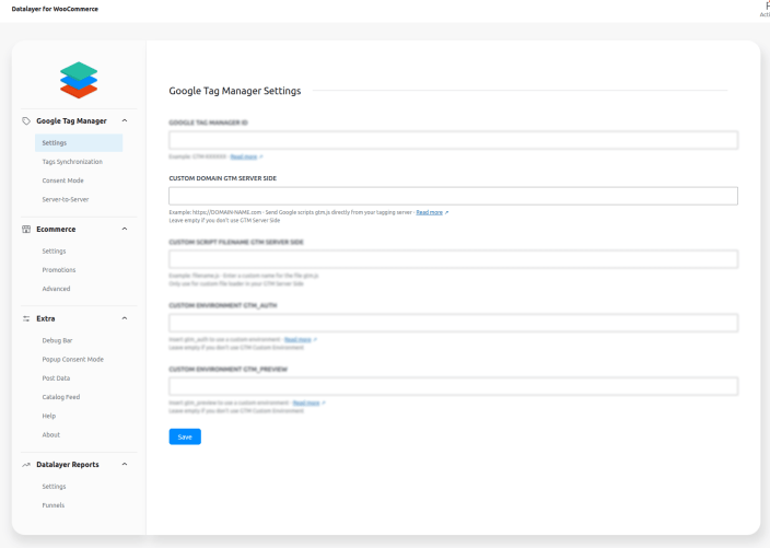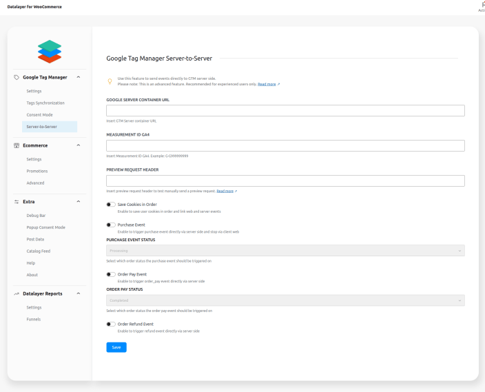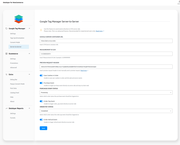 b – In WooCommerce > Datalayer for WooCommerce > Google Tag Manager > Settings > Custom Domain GTM Server Side and add your server domain