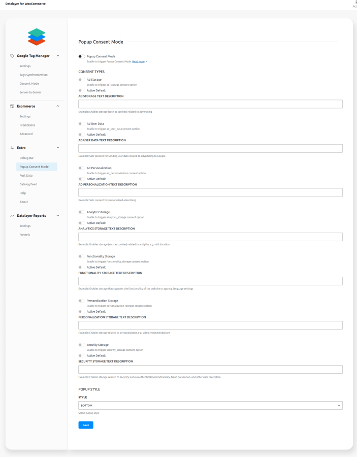 In WooCommerce > Datalayer for WooCommerce > Extra > Popup Consent Mode > Enable the option: Popup Consent Mode and configure the options