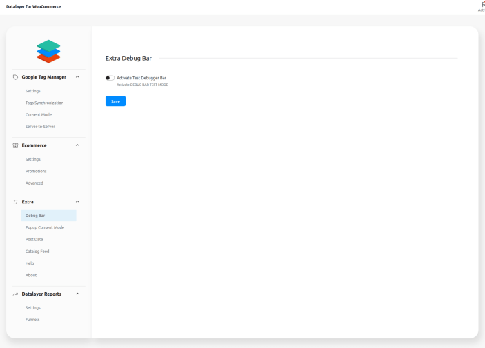 Activate Test Debugger Bar -> Enable this option to test Datalayer events on your site with the debug bar, by default, turned off