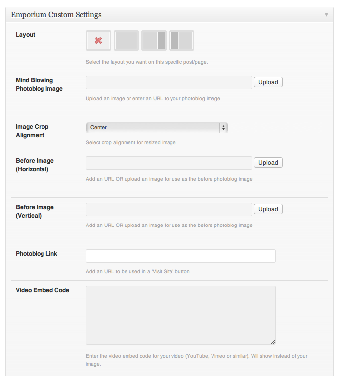 With the Inspire theme, there are 2 metaboxes for the portfolio image: portfolio thumb and portfolio large. This was perfect for: photoblog before and photoblog after. After implementing this into Emporium, I actually had to tweak it to play nice with the responsive design. I created a custom field for “photoblog before – horizontal” and “photoblog before – vertical” as I needed to deal with both photo orientations. There is probably a better way to go about it, but I was hacking away.