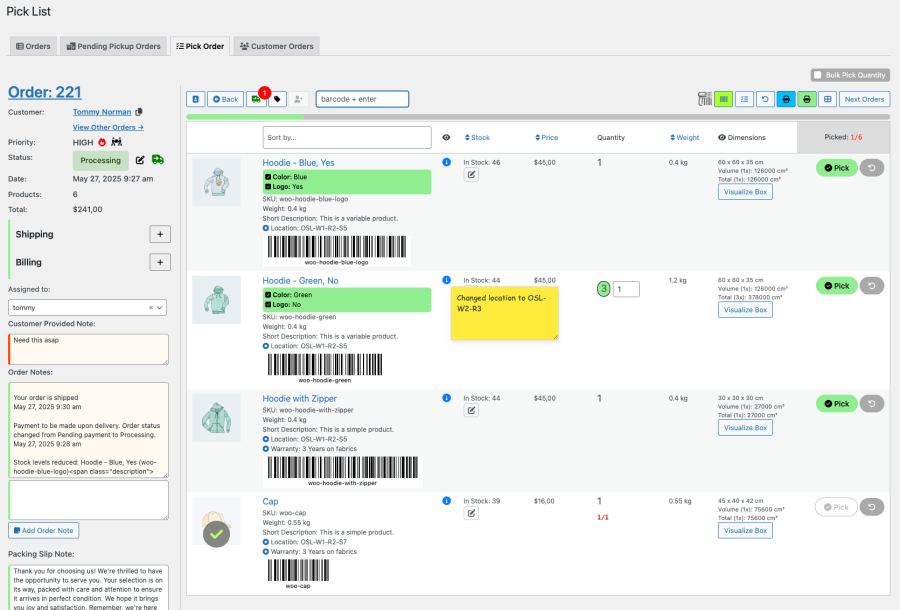 Manage order picking directly from the WooCommerce Edit Order page with real-time updates & instant access to tools.