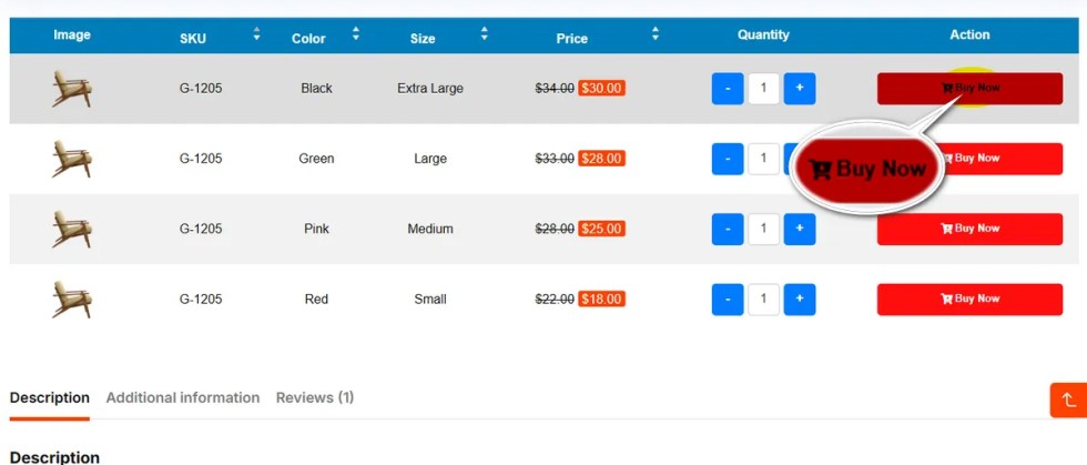 Here are the changes you can witness on a variation table of a variable product’s detail page.