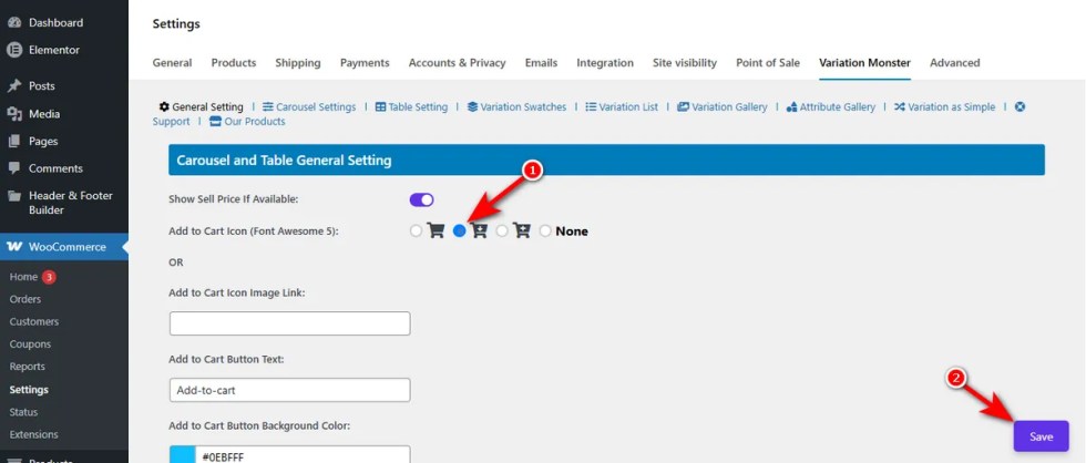 This setting lets you select a specific shopping cart icon from the Font Awesome 5 library to appear on your “Add to Cart” buttons.