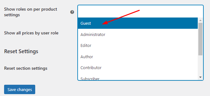 ↑ Back to topThis setting allows you to select the user roles that you want to display under Price by User Role: Per Product Settings meta box. The default value for Show roles on per product settings is None.