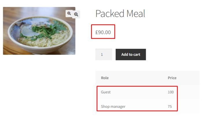 Similarly, if the Admin goes to the Product Page, then the price will be £90 and the prices for user roles Guest and Shop Manager will be displayed below: