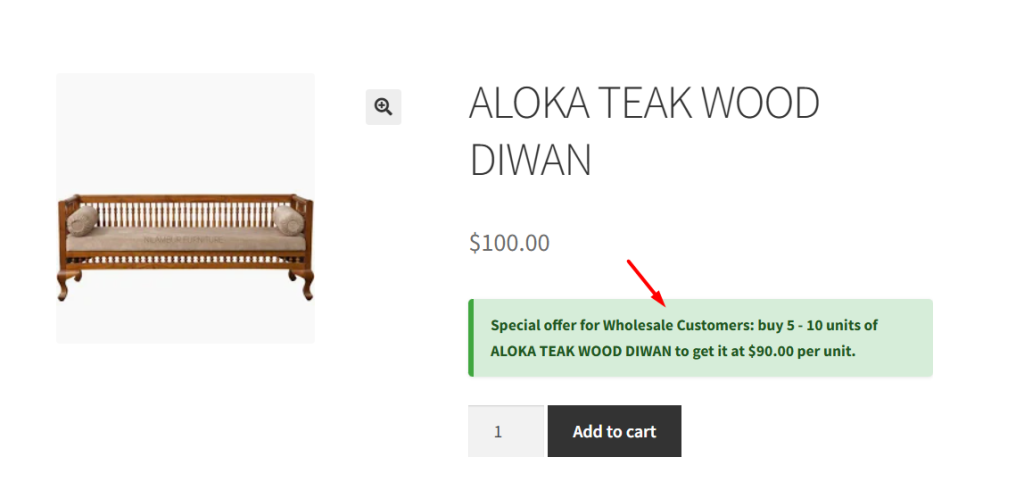 Save the changes, and on the frontend, it might display as:Â Special offer for Wholesalers: buy 5-10 units of ALOKA TEAK WOOD DIWAN to get it at $90 per unit.