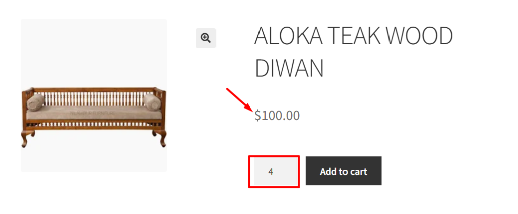 For example, let’s take the product ALOKA TEAK WOOD DIWAN, which has a regular price of $100. For the Wholesale Customer role, we set a Fixed Price of $90 that applies only when the quantity in the cart is between 5 and 10 units.