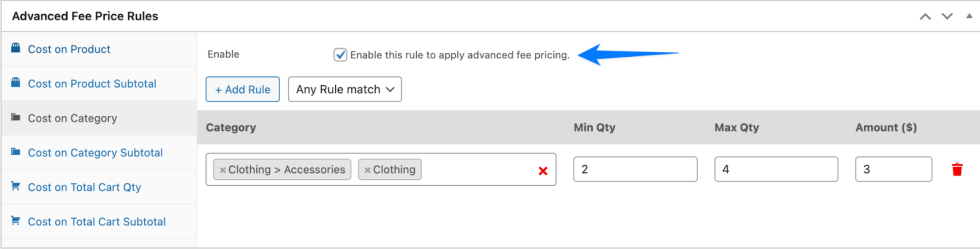 - Enable the option: Enable this rule to apply advanced fee pricing