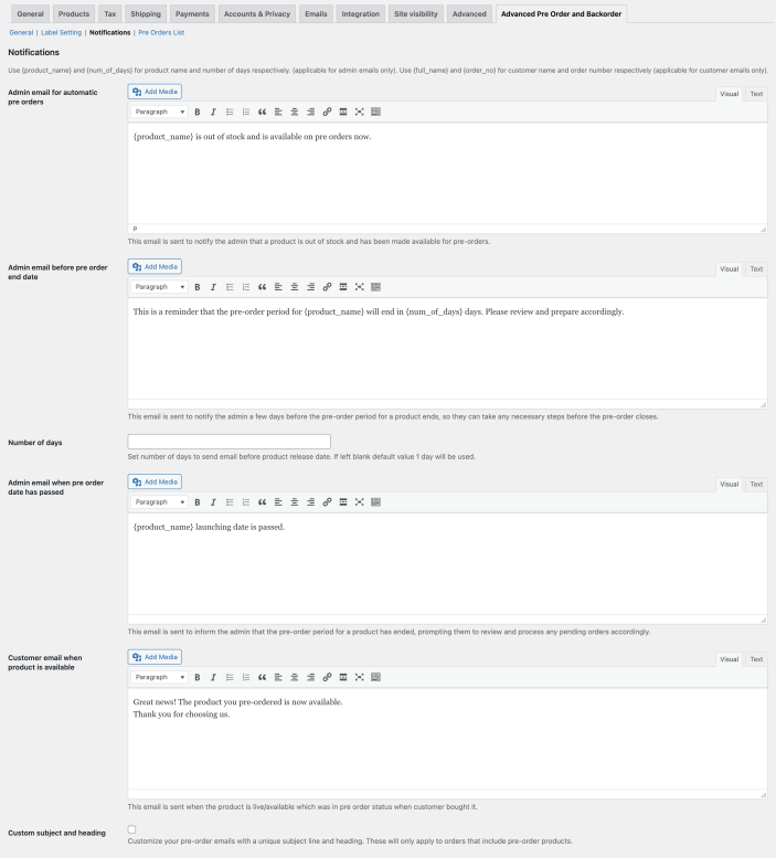 ↑ Back to topYou can access Email notifications from WooCommerce > Settings > Advanced Pre Order and Backorders > Notifications. You can customize the content of each of the following email using the variables like,