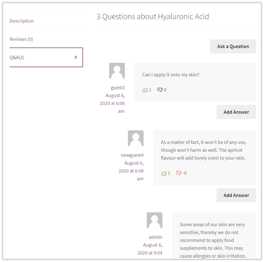 A question will start a continuous thread of answers, if any. If there are no questions, the following text is displayed “Be the first to ask a question about {product name here}”. Answers are displayed with a left margin for clarity reasons below the question. This helps see which reply belongs to which answer. Questions are arranged hierarchically according to their helpfulness and date of submission, and of course, depending on the Admin’s decision to pin them to the top.