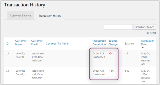 The name of a customer in the Customer Name column is an active link to redirect you to the Transactions History grid, where data will be filtered by the chosen customer.The Customer Balance grid has some standard WordPress features, namely: