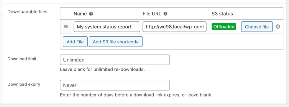 ↑ Back to topOffloading files with Amazon S3 can be done with any digital downloadable product setup in WooCommerce. Check the “Downloadable” box in the Product data metabox, as usual. The “Downloadable files” table will appear in the “General” settings tab, with a few additions: