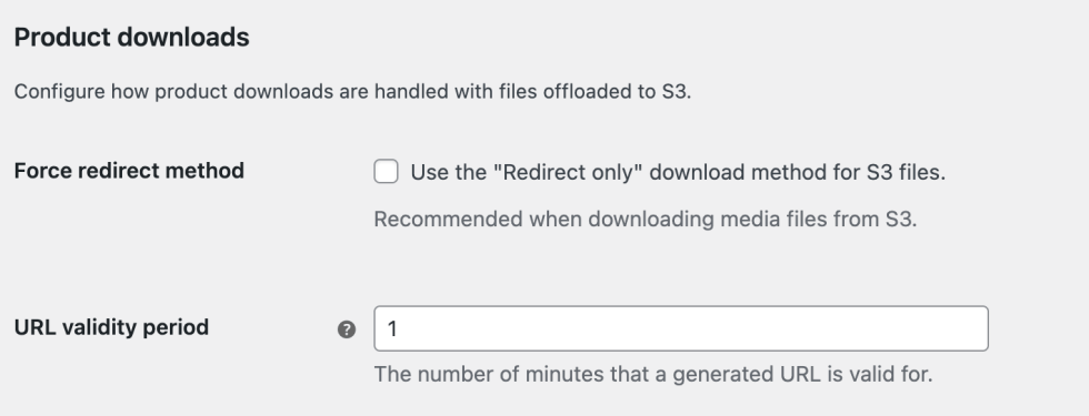 The URL validity period setting is to maintain the security of your downloadable products. Note that you can also use WooCommerce core settings alongside the Amazon S3 extension. This includes limits to the number of times a file can be downloaded, and more. The URL validity period makes sure that links to your downloadable products are impermanent. This prevents the open sharing of your links and their accumulation across the internet over time.