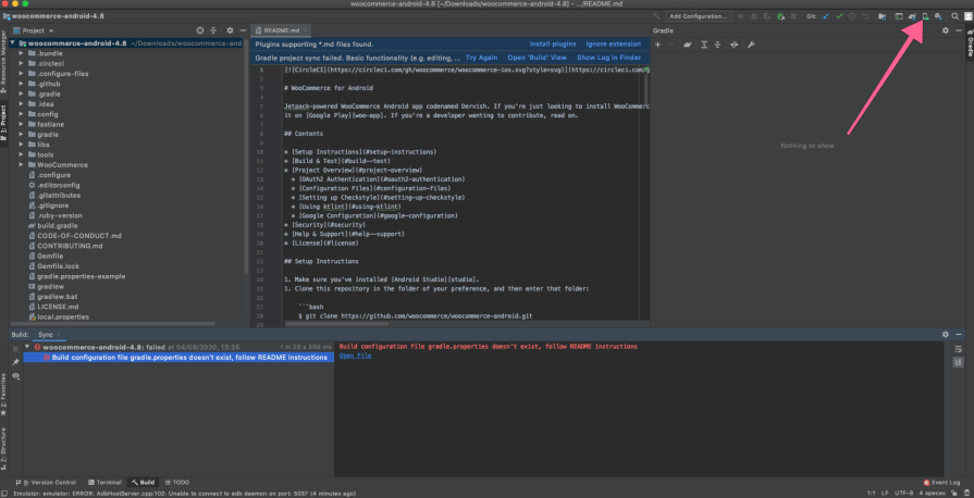 6. The project will start the installation in the Android Studio but won’t be able to be finished as it requires so-called build to be done. You won’t need that to continue with this process, but you will want to see a message showing Build configuration file gradle.properties doesn't exist, follow README instructions.