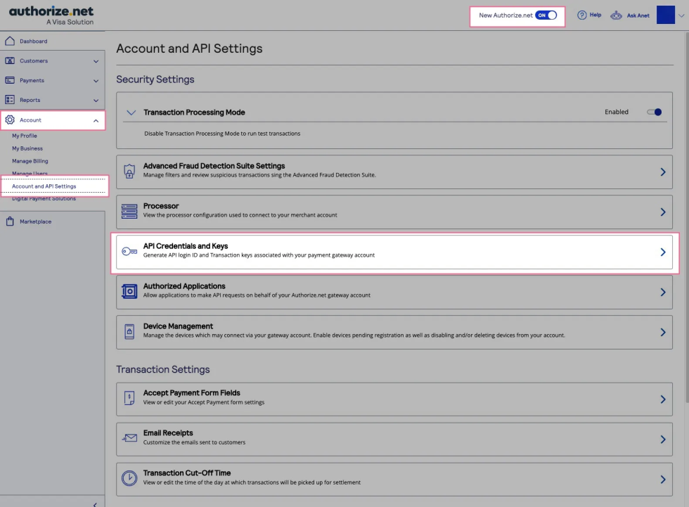 - Login to your Authorize.Net account (Screenshots below are for both the “Old” Account User Interface and the “New” User Interface rolling out in 2026).