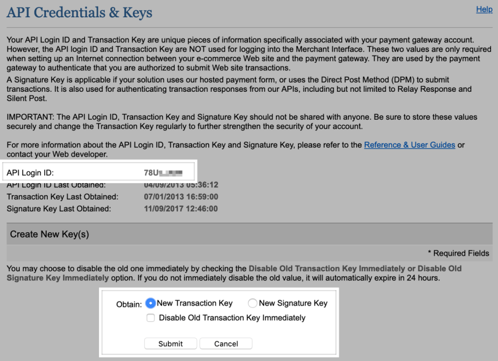 - Select the New Transaction Key radio button and click Submit. Copy the Transaction Key.