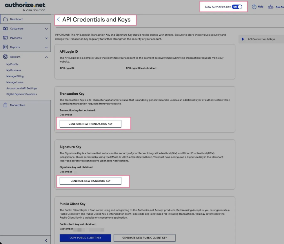 - API Signature Key: Optional. Only required if you want to enable webhooks for Authorize.Net account updates. Follow the steps above to generate your API Signature Key.