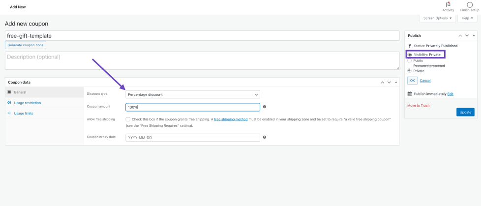 - Set the name via the Coupon Code field with an example name free-gift-template.Â
