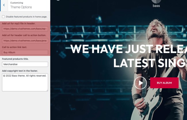 - In the theme options you will see other fields to add a link for the Call to action button, or change the button text.