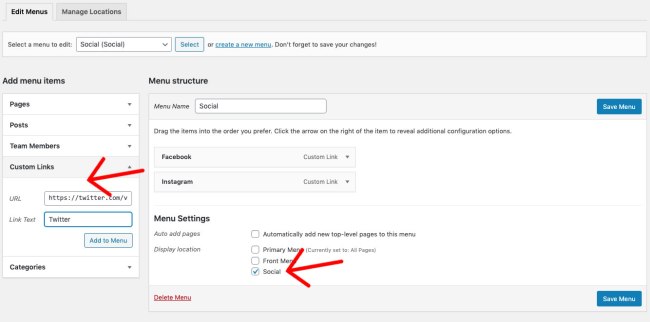 - In the bottom of the right side, check the box to display the menu in the Social location and click Save.
