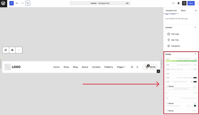 - In the block settings (right sidebar), expand Design to reveal available header templates.