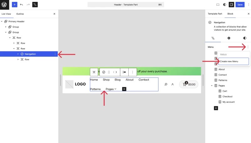 - In the Site Editor, locate the Navigation block—typically inside the header area.
