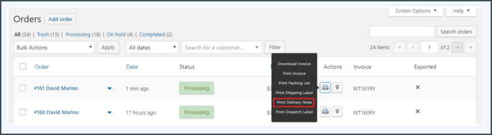 Printing Delivery Note From Orders Listing Page
