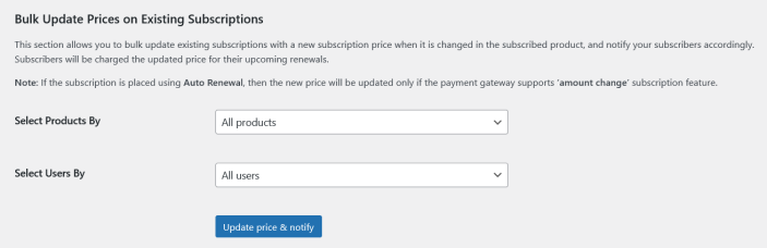 ↑ Back to topThis plugin allows you to bulk update prices for existing subscriptions. There are 2 methods available, depending on the number of subscriptions and filtering requirements.