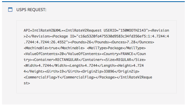- A embalagem usada está correta. O modo de depuração exibirá o peso e as dimensões da embalagem, e alguns plugins também terão uma linha “Packed” (Embalado) na saída do modo de depuração para informações mais detalhadas. Para saber mais sobre a embalagem de produtos, consulte nossa documentação Entendendo os cálculos de embalagem de produtos.