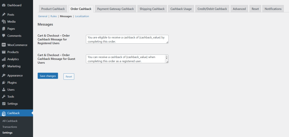 ↑ Back to topTo access the plugin settings navigate to Dashboard > Cashback > Settings