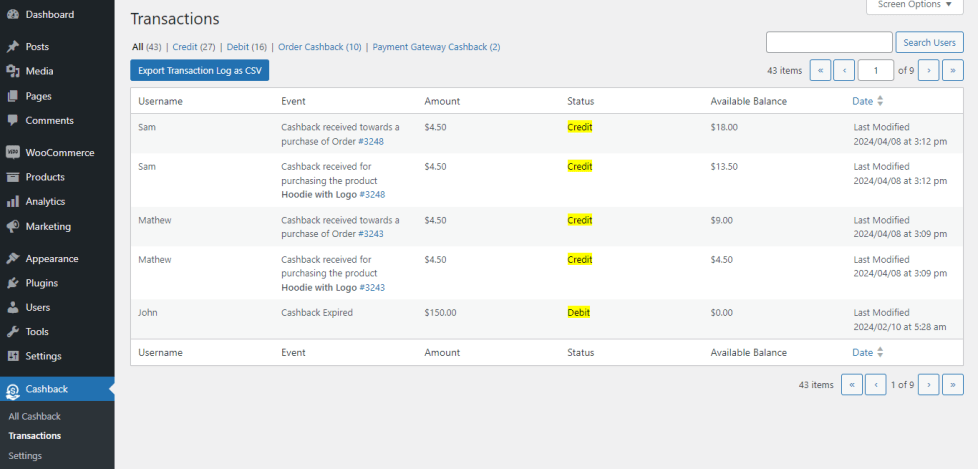 You can customize the log recorded for cashback received using specific payment gateway in the order at both frontend[My Account -> My Cashback] & backend[Cashback -> Transactions].