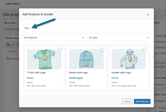- Add Products – Click Add products button to add items to the bundle using the product selection popup.