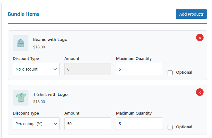 - Optional – Mark the product as optional within the bundle.