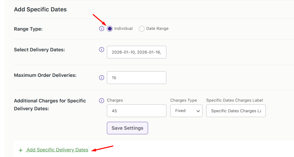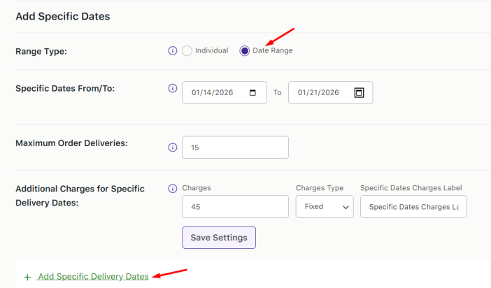 Now, if you wish to add specific dates for your orders, you can click on the ‘Add Specific Dates’ option. This allows you to add one or multiple delivery dates at once, apply additional charges, and restrict the maximum number of orders for those dates.