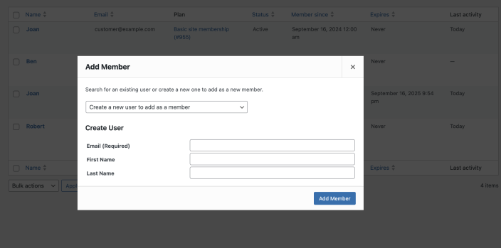 Members can always be manually added via the “Add Member” button. You can choose an existing customer to grant access to a plan, or you can create a new user in the same process.