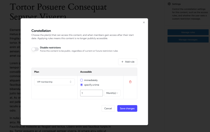 - Restrict content: Add pages, posts, categories, or tags that should be protected for members only. You can decide if the member gets access immediately once they subscribe, or if they have to wait a certain period after purchase to view the protected content. (Including whether they can access content during free trials or not.)