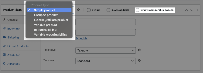↑ Back to topWhen you set up a product to sell a membership, you can create a simple or variable product (to sell memberships with a one-time fee or manual renewals), or you can use recurring billing to sell memberships with automated renewals. In either case, you must enable “Grant membership access” on the product when setting it up.