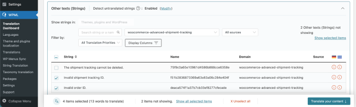 - Select the checkboxes for all the strings you want to translate and click Translate your content.