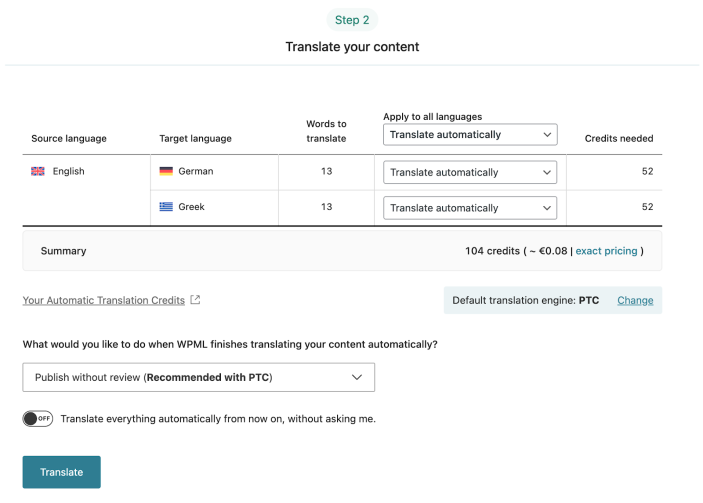 At Step 2, choose your translation method. To quickly translate multiple strings, choose Translate automatically from the dropdown. For the best results, ensure your translation engine is Private Translation Cloud (PTC), WPMLโs proprietary AI. The Translation Dashboard shows you the cost of automatic translation in euros and credits. If you want to translate strings yourself, choose Translate myself.
