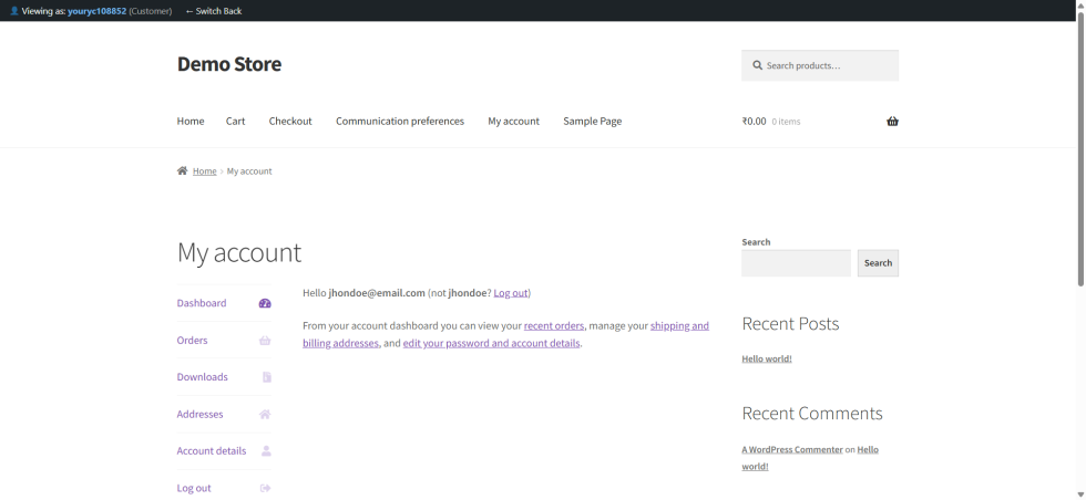 - You will be redirected to the store’s My Account page, now viewed as that customer.