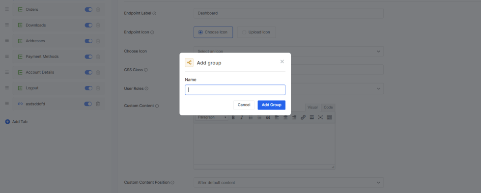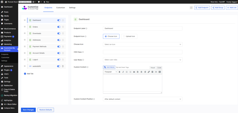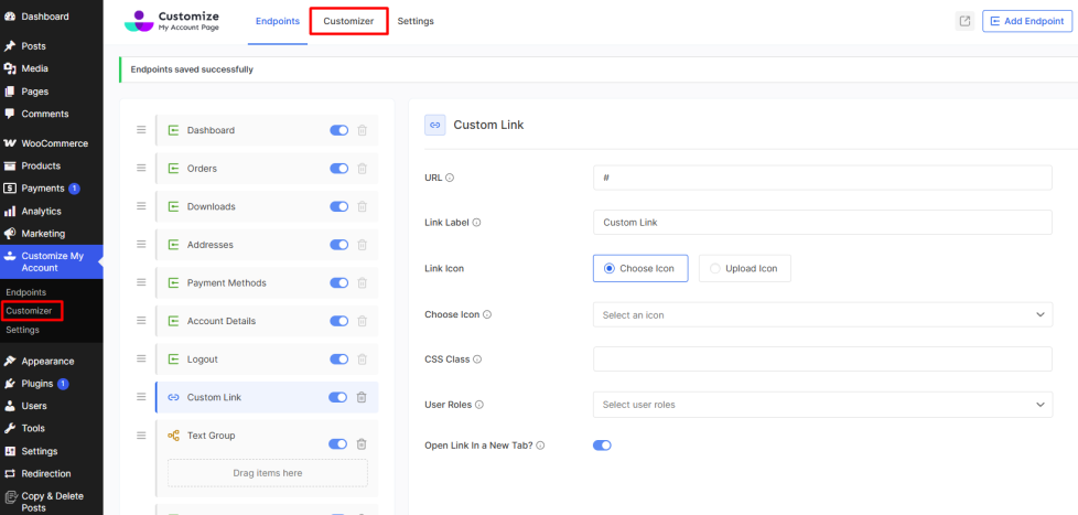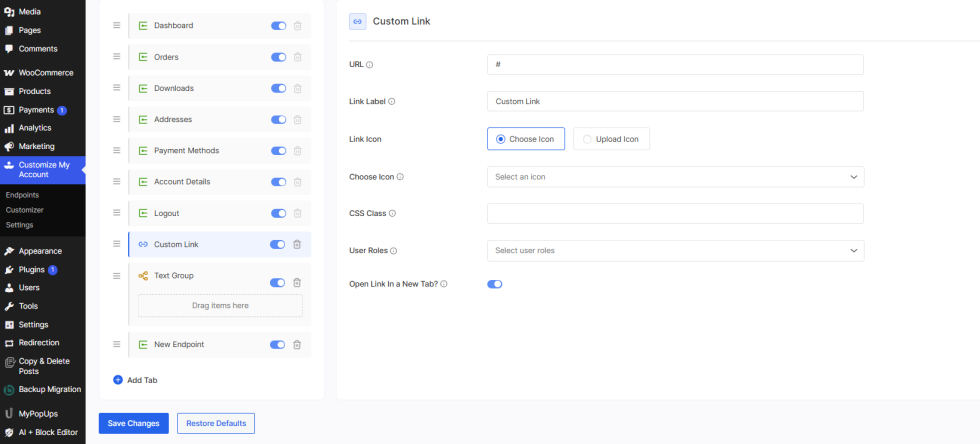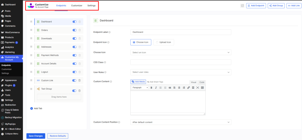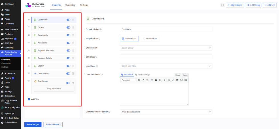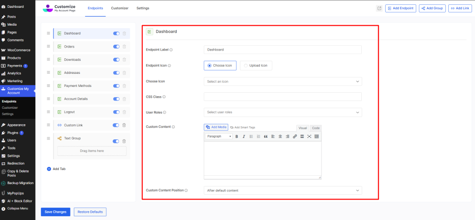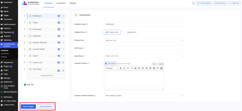 • Delete Button – Remove custom endpoints, groups, or links using the trash icon (not available for default WooCommerce endpoints)