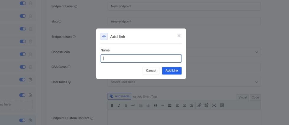 1. Click on the Add Link button on the top right (or inside “Add Tab” below the Endpoints list) and you will be asked to enter the Link Name.